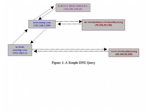 Having said that, let's begin with a brief look at how the Domain Name Service and BIND work. Suppose someone (myhost.someisp.com in Figure 1) is surfing the Web, and wishes to view the site http://www.wiremonkeys.org/. Suppose, also, that person's machine is configured to use the name server “ns.isp.com” for DNS lookups. Since the name www.wiremonkeys.org has no meaning to the routers through which the web query and its responses will pass, the user's web browser needs to learn www.wiremonkeys.org's IP address before attempting the query.
