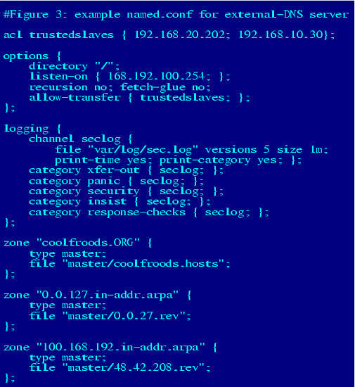 The hypothetical server whose configuration file is represented here is an external DNS server. Since its role is to provide information to the outside world about coolfroods.org's publicly accessible services, it has been configured without recursion. In fact, it has no “.” zone entry (i.e., no pointer to a hints file), so it knows nothing about and cannot even learn about hosts not described in its local zone files. Transfers of its local zone databases are restricted by IP address to a group of trusted slave servers, and logging has been enabled for a variety of event types.