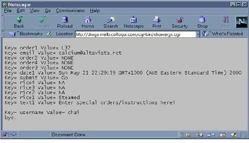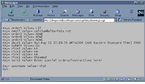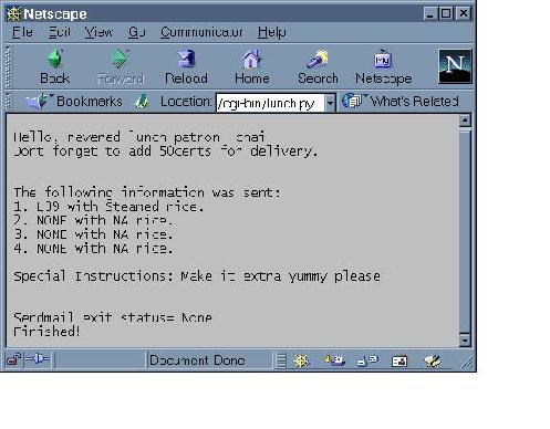 I opened Netscape, typed in http://localhost/lunch.html as the URL, filled in the form, selected my order and clicked on “Go”.