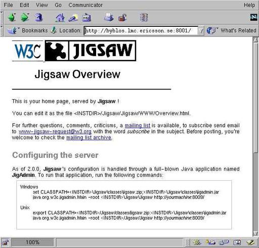 The Jigsaw server runs on any platform supporting Java. It has been tested on Windows 95/NT and Solaris 2.x. Many people have also reported successful installation and use on other platforms such as OS/2, MacOS, BeOS, Linux, AS-400 and AIX. I installed the Jigsaw server on two workstations powered by Red Hat 6.1 and 6.2, with JDK 1.1.8 and JDK 1.2.2 respectively, and in both cases it worked fine.