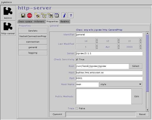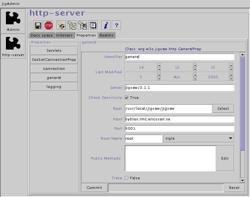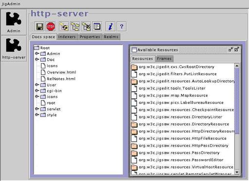 Jigsaw comes with an administration tool called JigAdmin. JigAdmin is a graphical interface that communicates with the JigAdmin Administration Server. This server can administer multiple Jigsaw servers running on the same machine, provided that those servers have been launched by the same Java Virtual Machine.