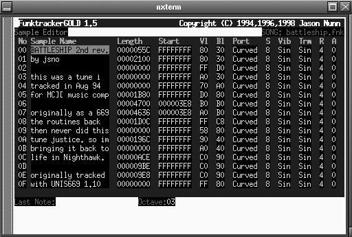 As of August 2000 I counted 13 trackers listed on the Linux Sound & Music Applications site. Which one(s) you prefer to try will depend on your available resources, particularly your graphics capabilities, as well as your interest in developing a tracker. For X users, Michael Krause's SoundTracker (see Figure 1) is designed with an excellent GTK interface graphics, while Cedric Roux's powerful Xsoundtrack (see Figure 2) uses common Xlib graphics. Jason Nunn's FunktrackerGOLD (see Figure 3) is an excellent console-based tracker requiring only the ncurses library for its graphics.