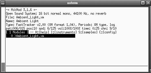 Mod players for Linux are also available in console and X interfaces. As noted earlier, almost every Linux distribution includes MikMod (see Figure 7), which is available in various incarnations (e.g., console, GTK, Qt, Xforms, and Java). The popular MODPlug player for Windows has been ported as a plug-in for the excellent XMMS player (see Figure 6) and is also the playback engine for Gmodplay.