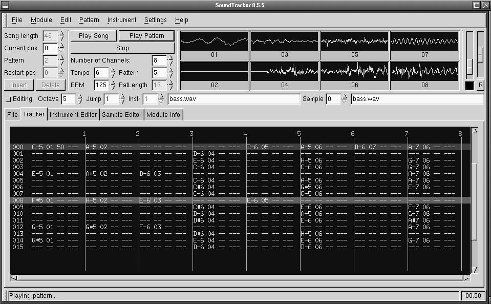 All sounds used in mods are sampled sounds, so you'll want to build a collection of samples that meets your compositional needs. You can rip samples from existing modules, or you can gather sounds from the various sample collection sites listed on the United Trackers and MODPlug Central web pages. SoundTracker can load any audio file type supported by libaudiofile, so you can freely mix WAV, AIFF and AU files in the same module.
