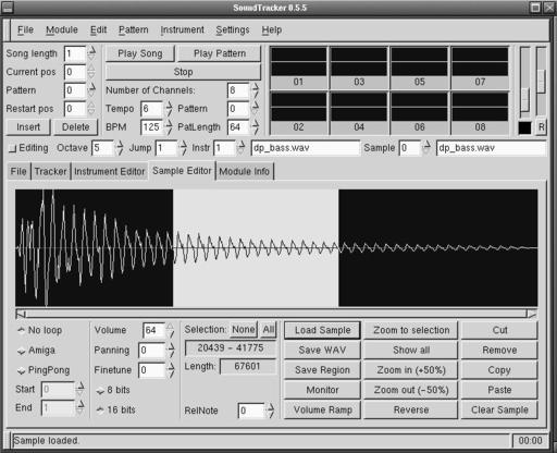 Figure 5 shows a bass WAV file loaded in the Sample Editor. SoundTracker's editor is not intended to be a full-fledged sound file editing environment, but it does provide basic cut/copy/paste operations, along with the loop mode settings and initial volume, pan and fine-tune controls. It also has the option to load 8-bit sound files.