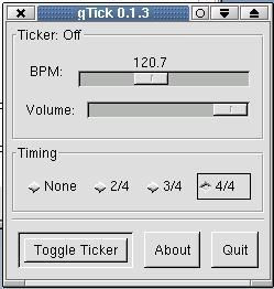 Those of you who are already musicians, or who aspire to be so, know the importance of rhythm and keeping time. A good metronome is one of the musician's essential tools. Alex Roberts knows this and to that end, has created gtick, a small GTK program that ticks off its beats in 1 (or none), 2/4, 3/4 and 4/4 time. You can set your timing from 30 to 250 beats per minute.