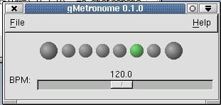 Another candidate for a nice metronome is David Lee Ludwig's gMetronome, another GTK program. This one uses a visual, moving-beat display; eight lights bounce the beat back and forth from one side to the other. The beat itself is adjustable from 0 to 250 beats per minute. At this time, this is strictly a visual metronome rather than an audible one. Perhaps notre ami David would like to talk to Alex, non?