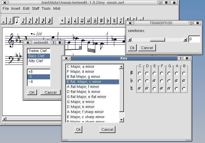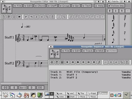 Rosegarden, written by Chris Cannam, Andy Green, Richard Bown and others, is certainly worth taking a look at, though somewhat more complex than NoteEdit. As a notation editor, the package offers multiple staffs, chords, beaming, triplets, slurs and a notes palette so that you can point and click your way to fame and fortune. This is also a MIDI sequencer with piano roll display. Like NoteEdit, you can also export your creation to MusixTex format for later printing.