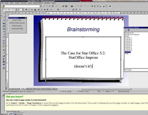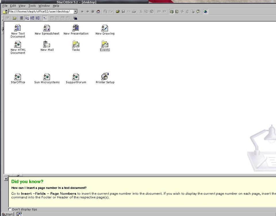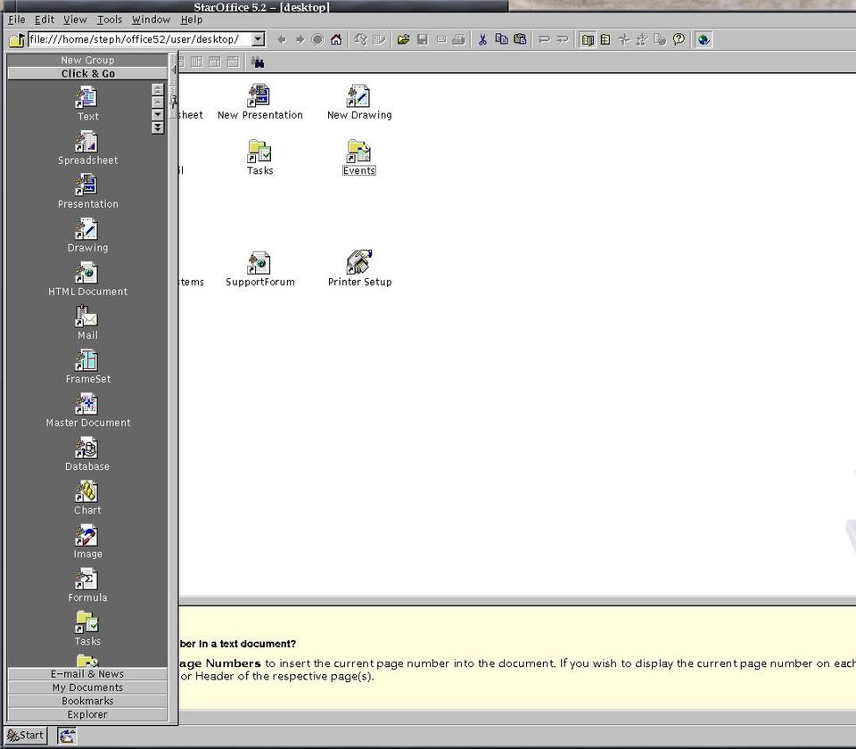 From what this writer has seen, three elements are missing from Star Office 5.2: consistency, modularity and unity. There is no consistent quality among the applications: some work very well indeed, while others are “not-yet-ready-for-prime-time”. Modularity would allow each application to run separately, as does Player, and therefore give the user more direct control over what s/he wants to run. Running everything from “one place” sounds nice, but better results would arise out of an expanded context menu than from a bulky pseudo-desktop, which is more visible and serves less purpose than the menus concealed in its left border.