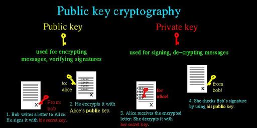 For our purposes here, it's enough to say that in a public-key scheme each user has a pair of keys. Your private key is used to digitally sign things, and to decrypt things that have been sent to you. Your public key is used by your correspondents to verify things that have allegedly been signed by you and to encrypt data that they want only you to be able to decrypt.