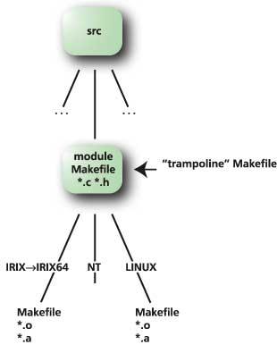 To make it easier to maintain, we decided to maximize the amount of code that would compile under either IRIX or Linux. This shrinks the codebase to a more manageable size. The theory is that each module would have a directory containing source code and under it would be subdirectories for architecture-specific items (compiled object files, libraries and executables). A Makefile in with the source files uses the OSNAME environment variable to bounce any make commands to the correct subdirectory depending on the architecture of the host (see Figure 2).