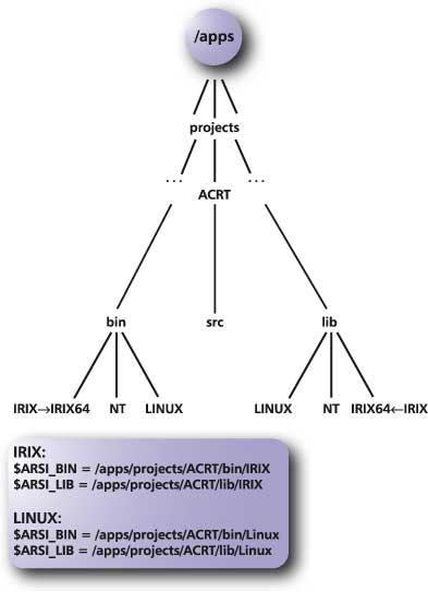 To keep the configurations as similar as possible across platforms, the files are arranged so that machines of different architectures use the same directories. For distinctions that can be made at compile time, there are different directories for compiled libraries with which modules link and where the executables are kept. Using environment variables for the BIN and LIB directories that incorporate the architecture name can help with that. For instance, on the IRIX systems, the binary directory (stored in $ARSI_BIN) might be /apps/projects/ACRT/bin/IRIX64. On Linux systems, it might be /apps/projects/ACRT/bin/Linux. Since the path is stored in the same environment variable, scripts and Makefiles can use it without regard for which type of system they are running (see Figure 3). Environment variables are also available at runtime to allow code to make decisions that can't be made at compile time. By embedding environment variables in configuration files, we can use the same configuration file for different architectures.