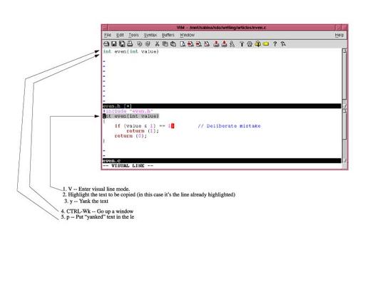 Vim has one new major mode: visual mode. In visual mode, highlight the text you want to edit, then type an editing command. In this example, you need to copy the first line of the function even from the bottom window and paste it in the top window.