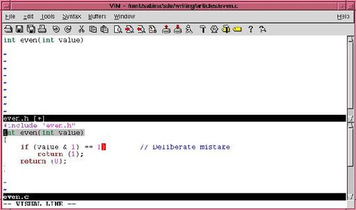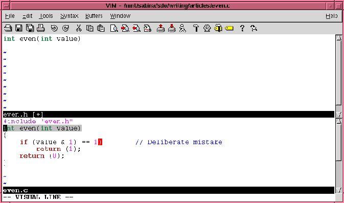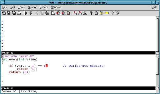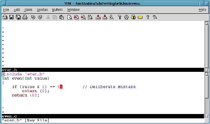 First, bring up both files in the editor. The command :split even.h splits the current window in two. The top-half gets the file even.h, and the bottom even.c (see Figure 2).