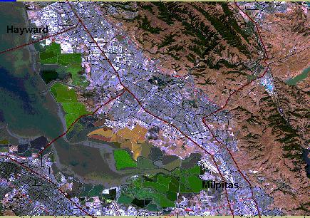 Figure 3. Composite image of the Milpitas California area. Multiple satellite images and vector layers are fused together to make the product.