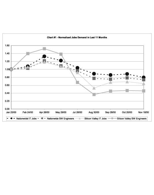 The falling fortunes of the dot-coms and the uncertainty of the election results, even before the election, have affected job figures. While the number of jobs offered has fallen since April, the decline has leveled off. Chart #1 shows the normalized job trends over the last 11 months. Ordinarily, things that don't change are not very interesting. But in this case, the fact that things have leveled off is good news.