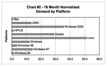 Over the last 18 months, a number of platforms have competed for dominance. One of the interesting aspects of this is how fast demand for the main platforms has been growing or shrinking. Demand is defined as the rate of acceleration/deceleration in the trend line for the period shown. From Chart #2, we can see that demand has been slowing for the older platforms, while the newer ones, like Windows 2000 and Linux, have accelerated faster than all others.