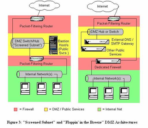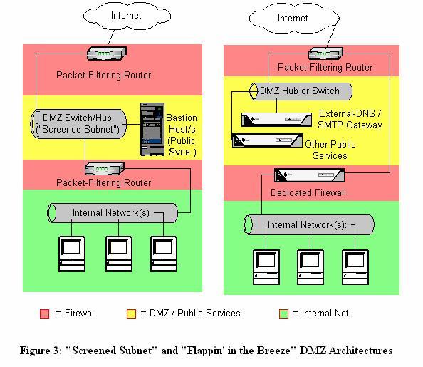 The right-hand illustration in Figure 3 shows what I call the “Flapping in the Breeze” DMZ architecture, in which there is a full-featured firewall between the Internet and the internal network but not between the Internet and the DMZ, which is placed outside of the firewall and is protected only by a single packet-filtering router.