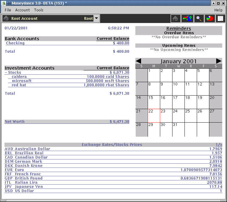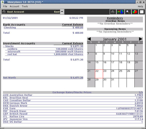 The main window popped up (see Figure 1). It's pretty unencumbered. The current date and time, along with the current month's calendar, are at the top of the screen, and next come summaries of my accounts (none yet) with a big goose egg for my personal worth.