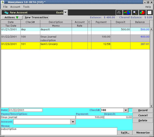 Back on the main screen (the “Home Page”, it tells me) I have a checking account with $0 in it. Clicking on it brings me to a detailed transaction window that lets me enter new transactions, reconcile my account, print checks, and set up on-line banking and bill payment (neither of which work yet). I can get graphs of my transactions also, but first I have to enter some.
