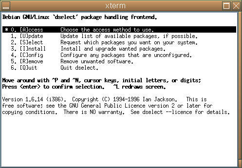 The console-based dselect interface was slick in its day but is showing obvious age. It isn't very acceptable by modern interface standards, and with so many packages it is difficult to navigate. You may be offered the option to make dselect operate via a web browser. Don't do it! We couldn't figure out how to make this work (we didn't try very hard) but had plenty of trouble turning it off so we could go back to the console interface.