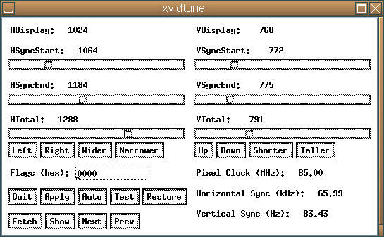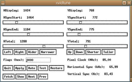 Once we get XFree86 working we need to adjust the frequency settings to center the image properly on our monitor. The xvidtune program handles that pretty nicely. You interactively adjust the screen until it matches the appearance you want. However, you can't automatically save that setting as in Windows. You must paste the setting's output by xvidtune into your XF86Config file. Once you get it close using xf86config you will edit the XF86Config file by hand many times making minor adjustments.