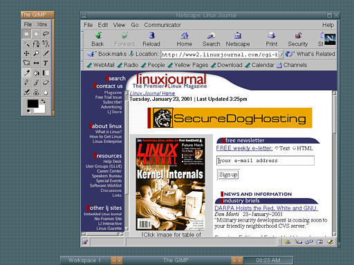To create our screen snapshots we are using The GIMP. We could use xwpick, xgrab, xv or xdmp, but The GIMP is an application we wanted to install anyway. It is recognized as one of the best applications available for Linux. The GIMP is very similar to Photoshop, a popular graphics editing program. To take a screen shot choose from the menus “File” “Acquire” “Screen Shot”. Doing that works fine in Blackbox, but for some reason fails in Window Maker. The GIMP is open source and available for other operating systems. We use it on WindowsNT, too.