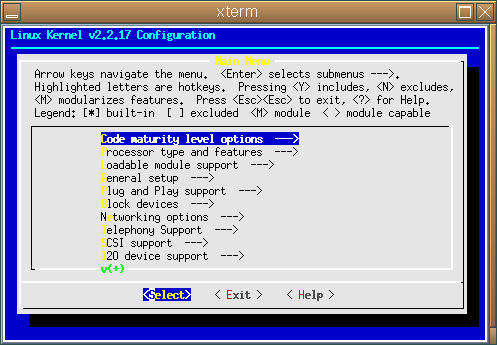 We then do make mrproper to delete any old kernel compile settings we might have. We use make menuconfig to launch the kernel configuration program. This is a very nice console app. If only xf86config and dselect looked this good! In menuconfig we install kmod (the new module loader) and Video4Linux. Everything we can make as a module (NTFS, VFAT and SMB, but not ext2) we do. There are a lot of options. It takes several tries before we drill through every menu choice and pick the appropriate settings.