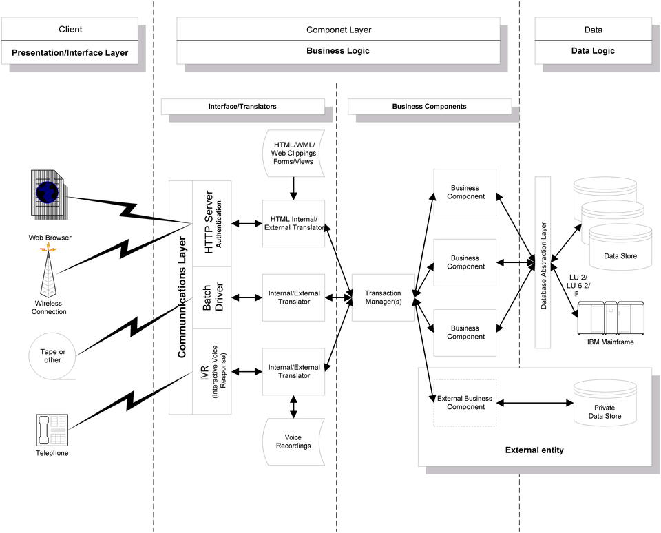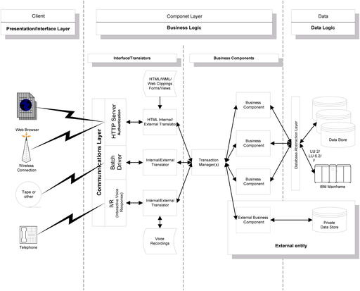 Interfaces and translators enable developers to focus on the business logic without the distractions of how the data is formatted or presented. These translators can use a common stream of data coming from the business component and move it to virtually any front end: Web, IVR, wireless or even print streams.