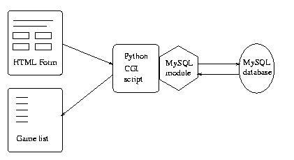 In order to make a better search engine, I had to use a different approach. First, the database should describe the collection of game files. Then, a multiple input field form should be created to allow the user to search for various pieces of information at the same time. Finally, there should be a way to set up communication between the browser and database server, in order to make the result of the database query available to the user as an HTML document. Thus, the whole search would be performed as mapped in Figure 2.