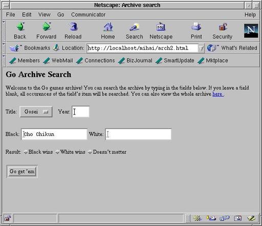 With the igo database created and the tables loaded with data, there was only one thing left to be done: write the Python CGI script that would take input from the user via the HTML form, query the database and produce a list of matching game files.