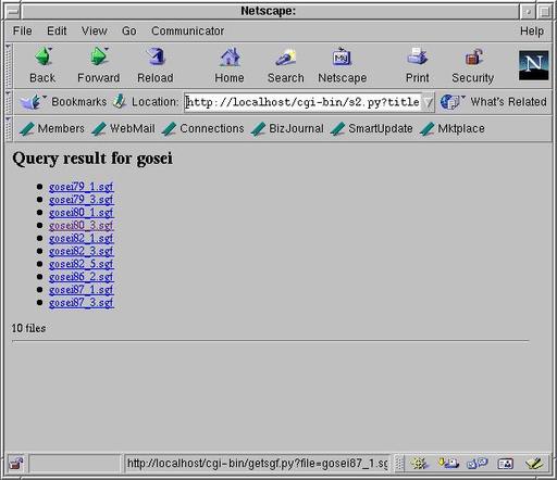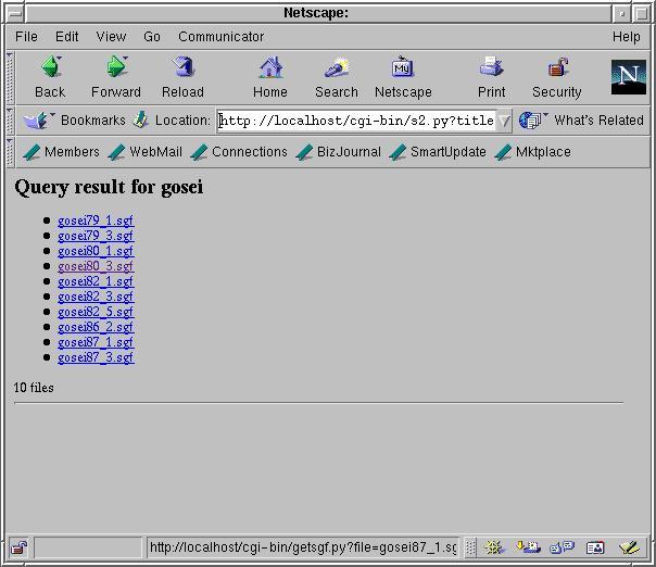 Of course, both search.py and getsgf.py must be made executable and moved to the cgi-bin directory. Also, a final trap to avoid: all the SGF game files must be placed somewhere within the DocumentRoot directory (as defined in httpd configuration files) in order to be found by a CGI script.