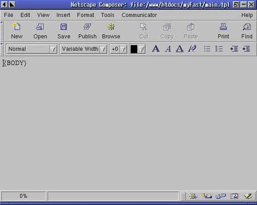 Better web editors exist, but Netscape Composer can do the job. Here's how to do it: in Netscape Navigator, select File --> Open Page. In the dialog that appears, enter or browse the full path to main.tpl in your example directory, and click “Open in Composer”. Netscape Composer will open a large window with a single word, {BODY}, displayed in the composer edit area (see Figure 3). That's the HTML-rendered version of main.tpl. To make the boss' changes, first select Edit --> Select All. {BODY}, including parentheses, should be highlighted in yellow. Now select Format --> Align --> Center. That takes care of centering. Edit --> Select All again. Now select Format --> Text Color, and pick a nice dark green from the swatches selector. Click OK. You should now see {BODY} in dark green. That's two down, one to go. Select Format --> Page Colors and Properties. Select the Use Custom Colors button in the radiogroup at the top of the Colors and Background Tab. Then select Background. Pick yellow from the Swatches Tab in the dialog that appears. Click OK, Apply and OK again. Your background in Composer should already be yellow. Now select File --> Save, then File --> Close.