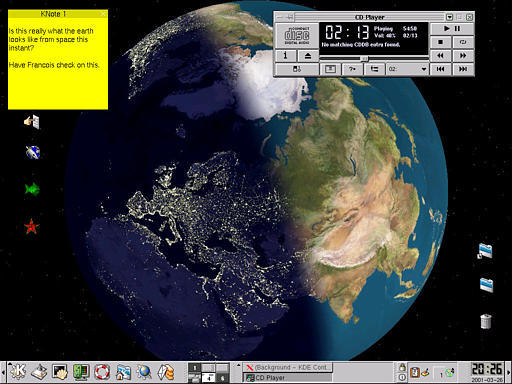 This will give you a nice background of the Earth as seen from the Moon. If you try this with KDE 2.1, you might find that nothing happens. That's because the control of the desktop is dealt with somewhat differently, and this is where you define your dynamic background. You might even notice that there is already an entry for Xplanet. I took the original definition and modified it to give me a different view of the world. Here's the program definition from mine: