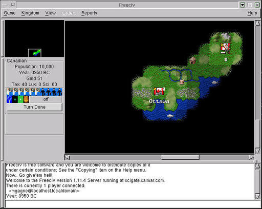 You may already be familiar with another version of this game. I must tell you right now that Freeciv is a different beast and worth your attention. The game can be played across a network with up to 30 different players. If your skills at world conquest are as good as mine, you may want to first play a few games on your own. I tried very hard to build the “Despotism of Canada” and failed on several occasions, even though I populated my capital city of Ottawa with scientists (Figure 4). Imagine.