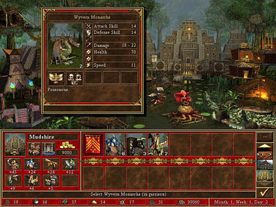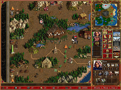 Game play focuses exclusively on the actions of the heroes themselves and the cities under your control. Heroes are responsible for exploring the areas around the cities, locating any of the nearly 130 different artifacts available, finding resources like mines or other sources of income for the city, as well as battling to defend the cities from attack, conquering new cities and fighting other heroes to expand your holdings. Cities produce gold currency from resources you provide them, which you then use to buy buildings and recruit heroes and warriors. Warriors provide valuable services to your heroes and act as a clearing house for all manner of soldiers or creatures your heroes may need in order to beef up their armies.