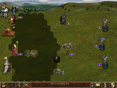 There are 128 different individual heroes, each with his or her own unique traits, strengths and weaknesses. These heroes lead your military might, exploring the lands with the armies you've placed under their control, claiming resources for your kingdom and protecting your sovereign territories from hostile invaders. Heroes themselves do not participate in battles, but each has various types of spells, knowledge and skills they can use to drastically help the troops under their command. When in battle, a turn-based combat begins and a close-up view of the hexagonal-grid battlefield is presented, as shown in Figure 3.
