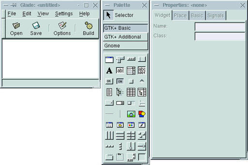 When launched, Glade displays three top-level windows (see Figure 1). The application main window shows the contents of the current Glade project file as a list of top-level windows and dialogs defined in the project file. The Palette window shows the Gtk+ and GNOME widgets supported by Glade. When a widget is selected for editing, the Properties window displays the current values of that widget's properties.