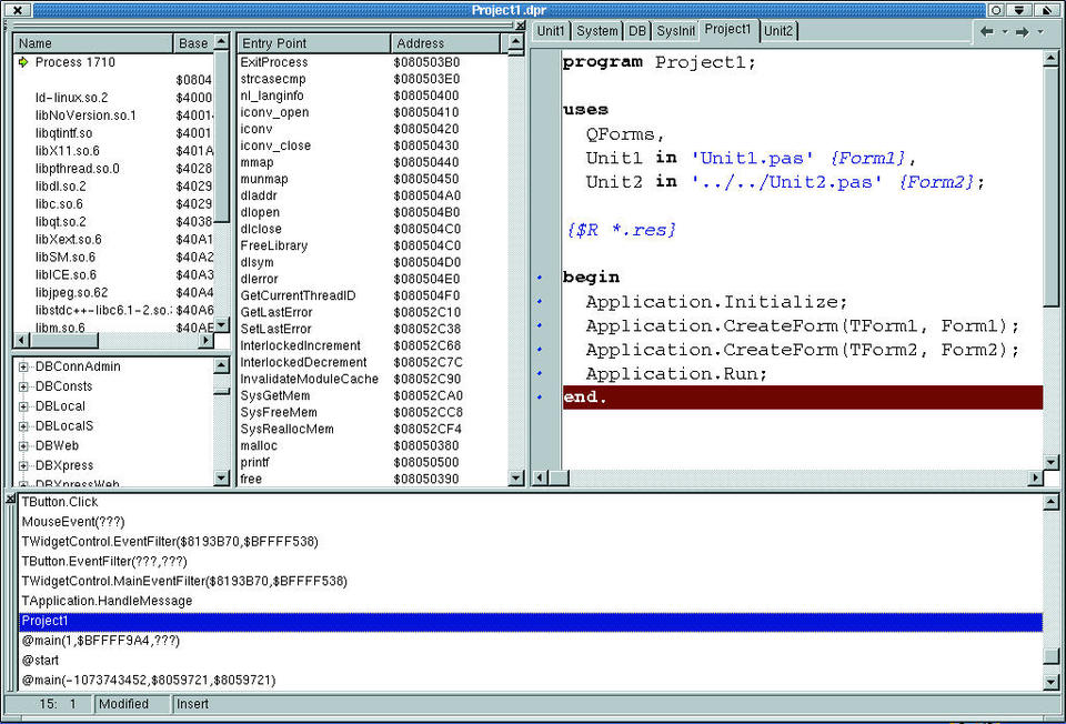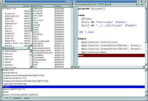 Debugging is the standard useful fare. It is a good implementation but nothing extraordinary (like changing the code while debugging and carrying on execution without restarting the program). I was extremely pleased to discover that GDB supports the Kylix-generated binaries. Unfortunately, I could only use GDB to debug at machine code level as the symbol table failed to load. I either was using an incorrect version of GDB or did not have a correct compilation flag set. The Kylix debugger and GDB provide a win-win situation for beginner and advanced users alike (see Figure 3).