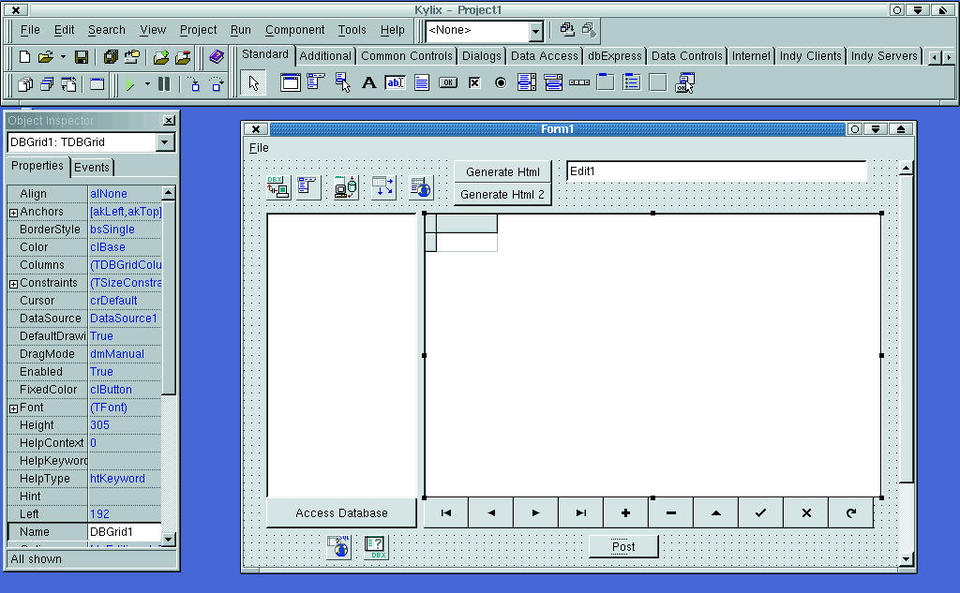 The Kylix GUI builder is a good commercial front-end builder (see Figure 4). Kylix extends what is usually expected from GUI builders (as RAD components), such as database connectivity and web server tools (which have nothing really to do with the GUI), by actually representing them via the GUI. This use of nonvisual RAD programming components in the GUI allows for easy access to associated GUI front ends.