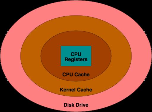 The physical nature of disk drives makes their performance characteristics different from the other storage areas mentioned in this article. The other storage areas can access any byte with equal speed. Disk drives, with their spinning platters and moving heads, access data near the head's current position much faster than data farther away.