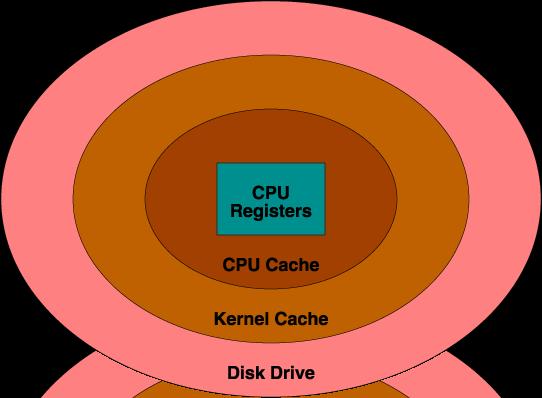 To understand hardware performance issues, it is important to understand what is happening inside the computer. For simplicity, a computer can be thought of as a central processing unit (CPU) surrounded by storage. On the same chip with the CPU are several CPU registers, which store intermediate results and various pointers and counters. Surrounding this is the CPU cache, which holds the most recently accessed information. Beyond the CPU cache is a large amount of random-access main memory (RAM), which holds executing programs and data. Beyond this main memory are disk drives, which store even larger amounts of information. Disk drives are the only permanent storage area, so anything to be kept when the computer is turned off must be placed there (see Table 1). Figure 1 shows the storage areas surrounding the CPU.
