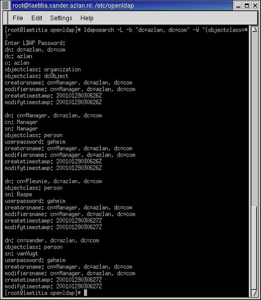 You will be prompted for your password, which is, of course, the password of the root account as specified in slapd.conf. If everything goes well, the data should now be added to the directory.
