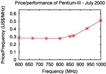 Figure 4 shows the ratio between price and performance for the Pentium III processor. The prices shown are an average of typical prices from retailers in the US. As one can see, old processors are cheap but relatively slow. New processors are faster but much more expensive. The optimal price/performance ratio is obtained in between.