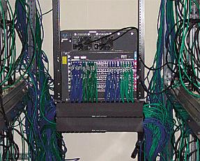 Figure 3. 156 Dual-Processor PC Cluster. The boxes are connected using a standard 100Mbps Fast Ethernet network (the green and blue cables). In the back, one can see the 192-port Cisco switch. The height of the shelving system is approximately eight feet.