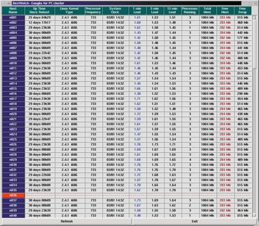 In Figure 6, we show a Tcl/Tk interface to the Ganglia package. The GUI we use is based on another open-source package, bWatch by Jacek Radajewski (sci.usq.edu.au/staff/jacek/bWatch). We modified it for our needs and to use Ganglia instead of standard rsh commands for much faster access to the nodes. Also, VA Linux has recently released the VACM package (VA Cluster Management), which we have not yet installed.