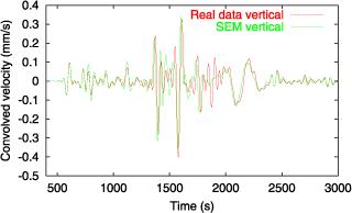 Due to the fact that the waves travel all around the globe, seismic recording stations in other countries were able to detect the Bolivia earthquake. Figure 8 shows an actual record from a station in Pasadena, California and the corresponding record simulated by our method. Again, the agreement is satisfactory. At each time step, this simulation required solving a system of equations with 500 million unknowns (also called the degrees of freedom of the system). Simulating the propagation of seismic waves for an hour and a half after the earthquake took 48 hours on the cluster using half of the nodes (150 processors).