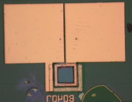 Figure 2. Typical VCSEL: large rectangles are contact pads for the test probes. The actual lasing area is the small gray square at bottom center.