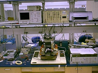 Two pieces of equipment are key to characterizing the VCSELs. First is the probe station that is basically just a microscope with some tiny probes and a light meter. The probes apply the power to the device, and we measure the power produced with the light meter. A 4155B parameter analyzer from Agilent is the second piece of equipment. This analyzer is programmed to sweep the current level and measure the voltage and light. It has two main ways of being controlled: front panel and the GPIB interface. Granted, the GPIB port is a popular scientific interface and allows us to do fancier tests by controlling the test setup with a computer as well as collect the data, but our controlling computer is about five feet down the lab bench and cannot be moved closer. This makes it difficult to start the test when the probes are in place. Fortunately our main test is simple to program through the front panel. Our test routine is to position the probes by looking through the eyepiece of the microscope, reach up carefully and push the test button on the parameter analyzer and then save the data. Figure 3 shows the lab hardware.