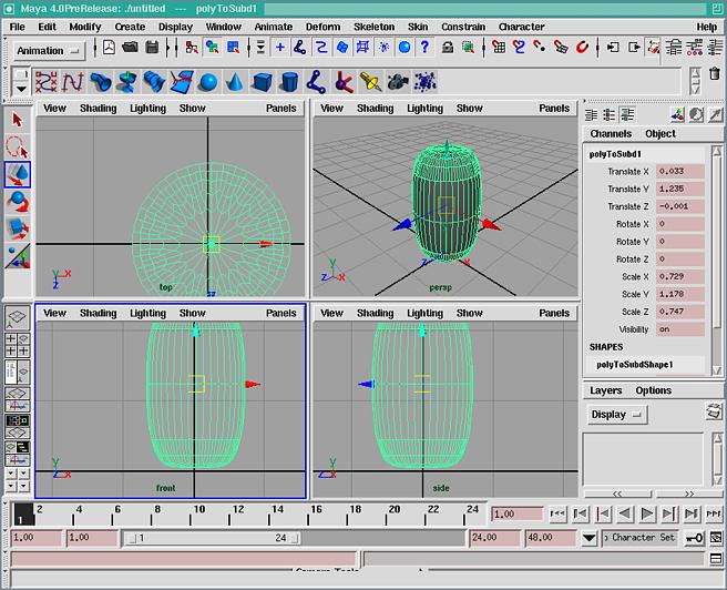Maya is a large application and needs some time to load its plugins. Like the popular Linux image editor, the GIMP, it takes a while to load, but once it's up, it's fast. After Maya is loaded, you are presented with a grid plane in 3-D space. The functionality of Maya can be categorized roughly as modeling, animation, dynamics, shaders, rendering and plugins. Models are created from polygons, but the shapes may be faceted or smooth and organic. Working in a 3-D animation package is more like sculpting than drawing. You do need to be an artist.